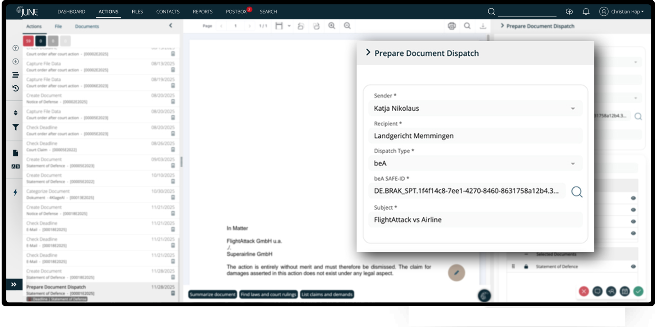 “With JUNE, we map a wide variety of process types from multiple departments in a shared work environment. Standardized workflows ensure that tasks, deadlines, and responsibilities are clearly defined. Document creation runs directly from the file using intelligent templates – content, attachments, and recipients are automatically pulled by AI.